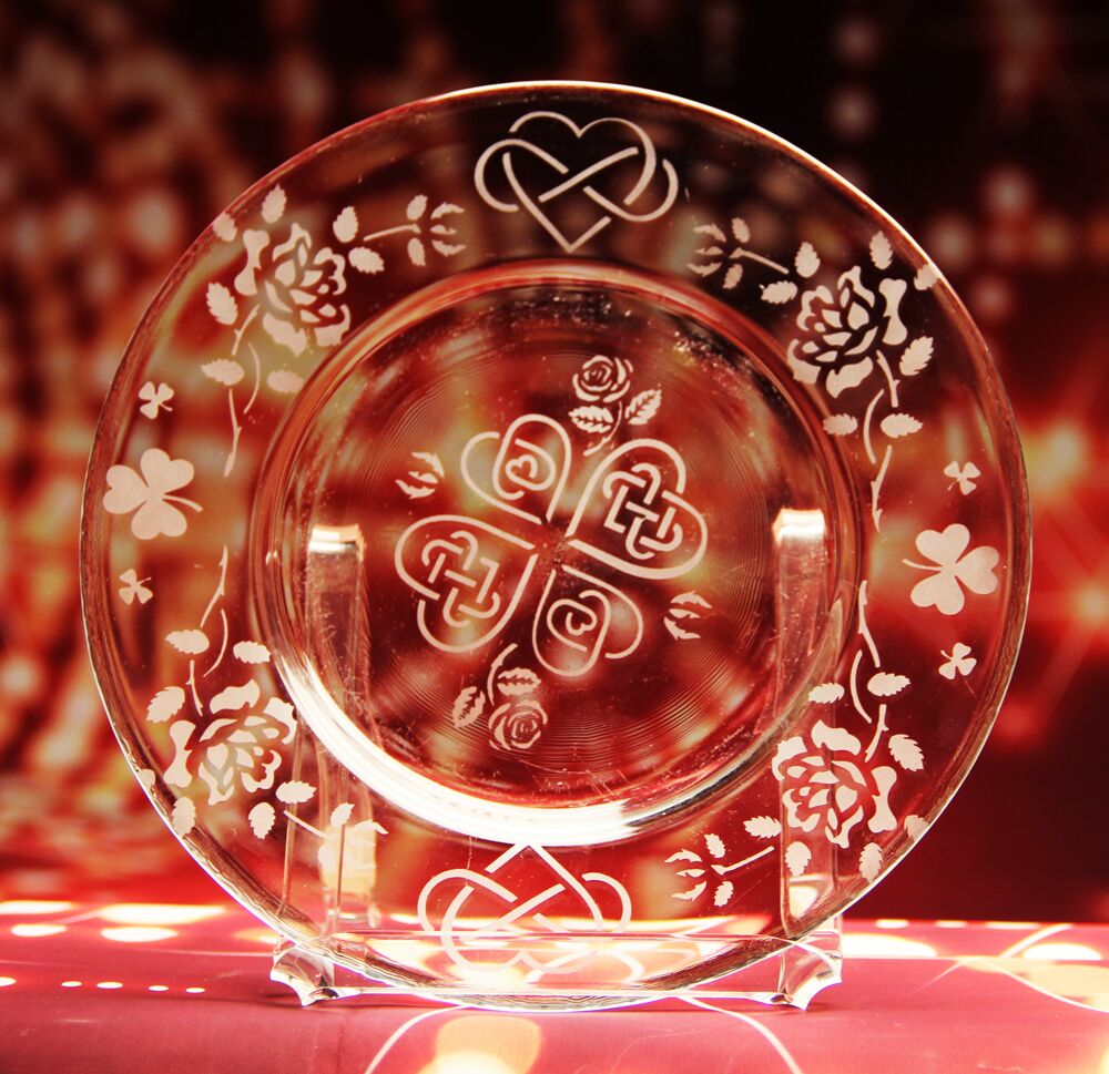 - Use the hover and press method to place 2 hearts into the empty spaces between the hearts in the center of the plate to make the shamrock shape. Put the curved roses on either side of the other infinity heart on the rim. Use the etching cream as before to etch these onto the glass.