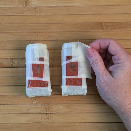 - After preparing the glass, stack the stencils from the bottom upward on one side of the shaker. Place the word at the bottom followed the cherub and then the heart.